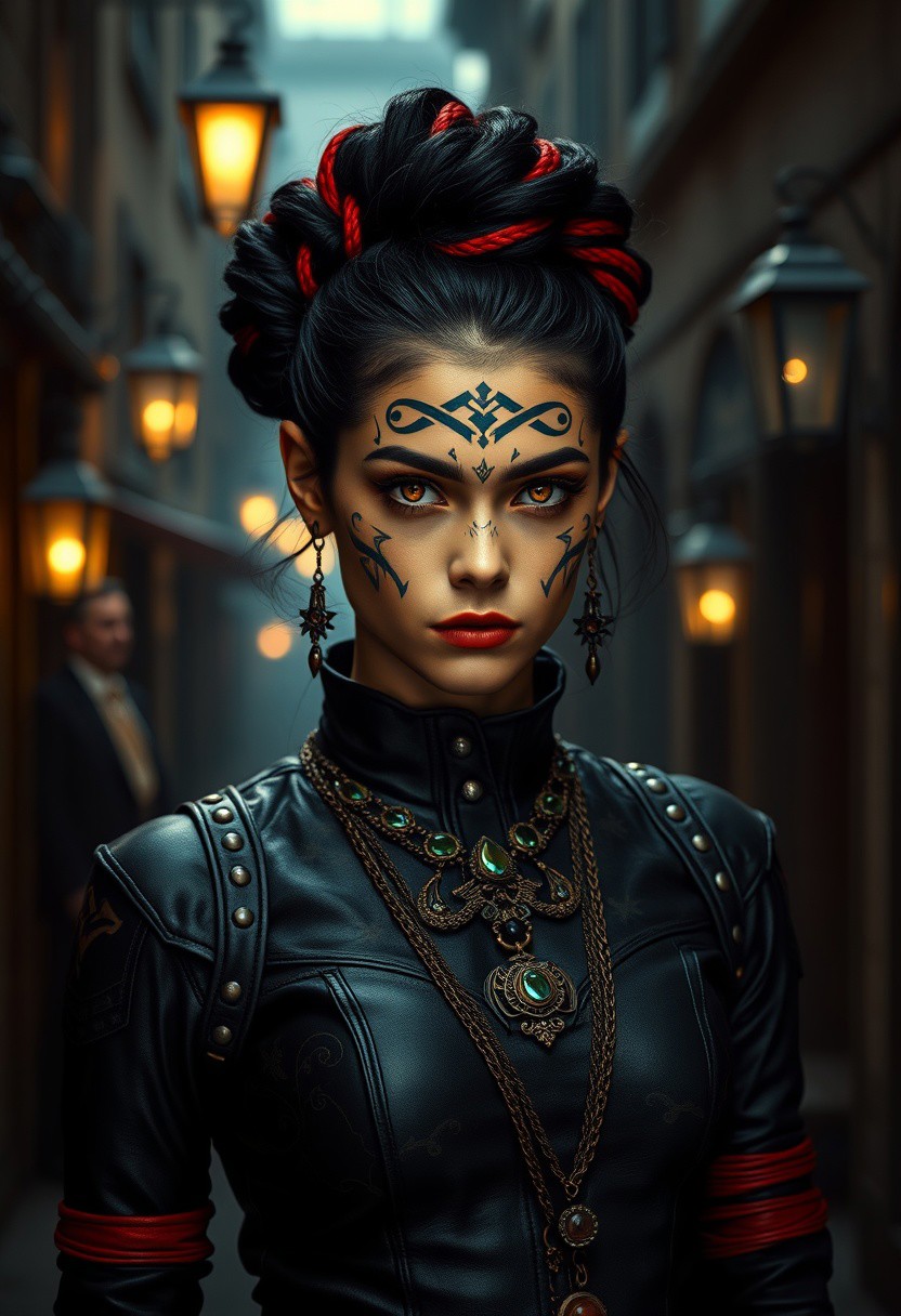 The image portrays a striking young woman with a commanding presence, standing in a dimly lit, atmospheric urban setting. Her dark hair is styled in an intricate updo with woven red accents, creating a dramatic contrast. Her face is adorned with ornate tattoos and tribal-like designs that radiate from her forehead and cheeks, emphasizing her enigmatic aura. She wears a high-neck leather outfit with intricate patterns, complemented by layered, antique jewelry featuring bold gemstones. Her piercing golden eyes convey intensity and mystery, while her surroundings—a shadowy, narrow street lined with weathered architecture and faint lantern light—enhance the scene's moody, steampunk-inspired aesthetic.