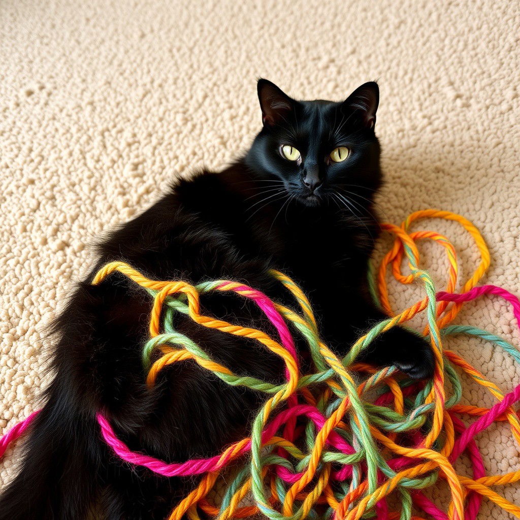 solid black american shorthair cat laying on beige carpet tangled in bright multicolor yarn