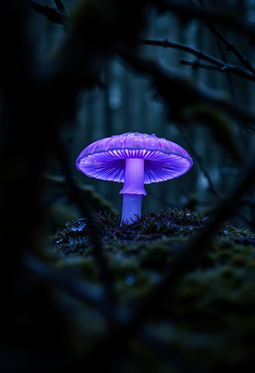 Photorealistic film image: A mushroom, emitting a supernatural violet glow, sprouts form the frozen moss in the dense, dark forest in winter. Our view is partially obscured by heavy branches, shaggy with moss. Shallow depth of field.