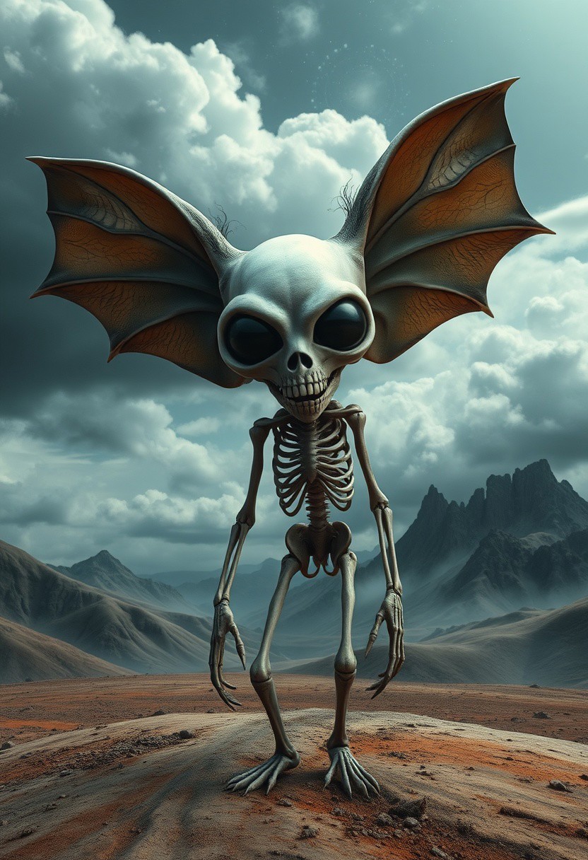 The image depicts a surreal, otherworldly creature standing on a textured landscape under a sky filled with dramatic clouds and faint cosmic patterns. The creature is characterized by a skeletal face with large, bulbous eyes that dominate its alien-like visage. Its bat-like ears are oversized and membranous, adding to its eerie appearance. The body is thin and slightly hunched, covered in wispy fur, with long, bony arms and claw-like fingers. The creature's sharp, fang-like teeth protrude ominously, creating a sinister expression. The background features rolling hills and jagged peaks, with an ethereal, dreamlike quality that enhances the fantastical and unsettling atmosphere.
