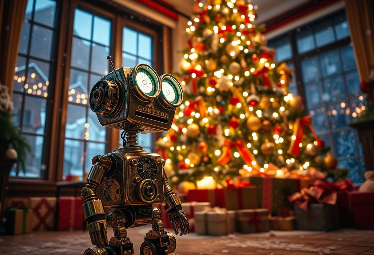 A dramatic very wide low-angle dutch shot of a very small, clockwork automaton, its brass and chrome frame gleaming in the soft, warm glow of a dazzling steampunk Christmas tree. The automaton's large, inquisitive eyes, composed of LED lights, scan the colorful ornaments and the presents piled beneath. A soft snowfall blankets the scene outside the enormous window, casting a magical nighttime glow over the room, the robot's human family visible in the background cropped and out of focus. The hyper-realistic image should capture the magic and wonder of this Christmas scene, with a focus on the intricate details of the robot and the Christmas tree. The color palette should be rich and warm, with deep reds, golds, and greens, accented by the cool, metallic tones of the robot. The overall style should evoke a sense of timeless wonder, with a touch of steampunk flair and a hint of otherworldly magic.