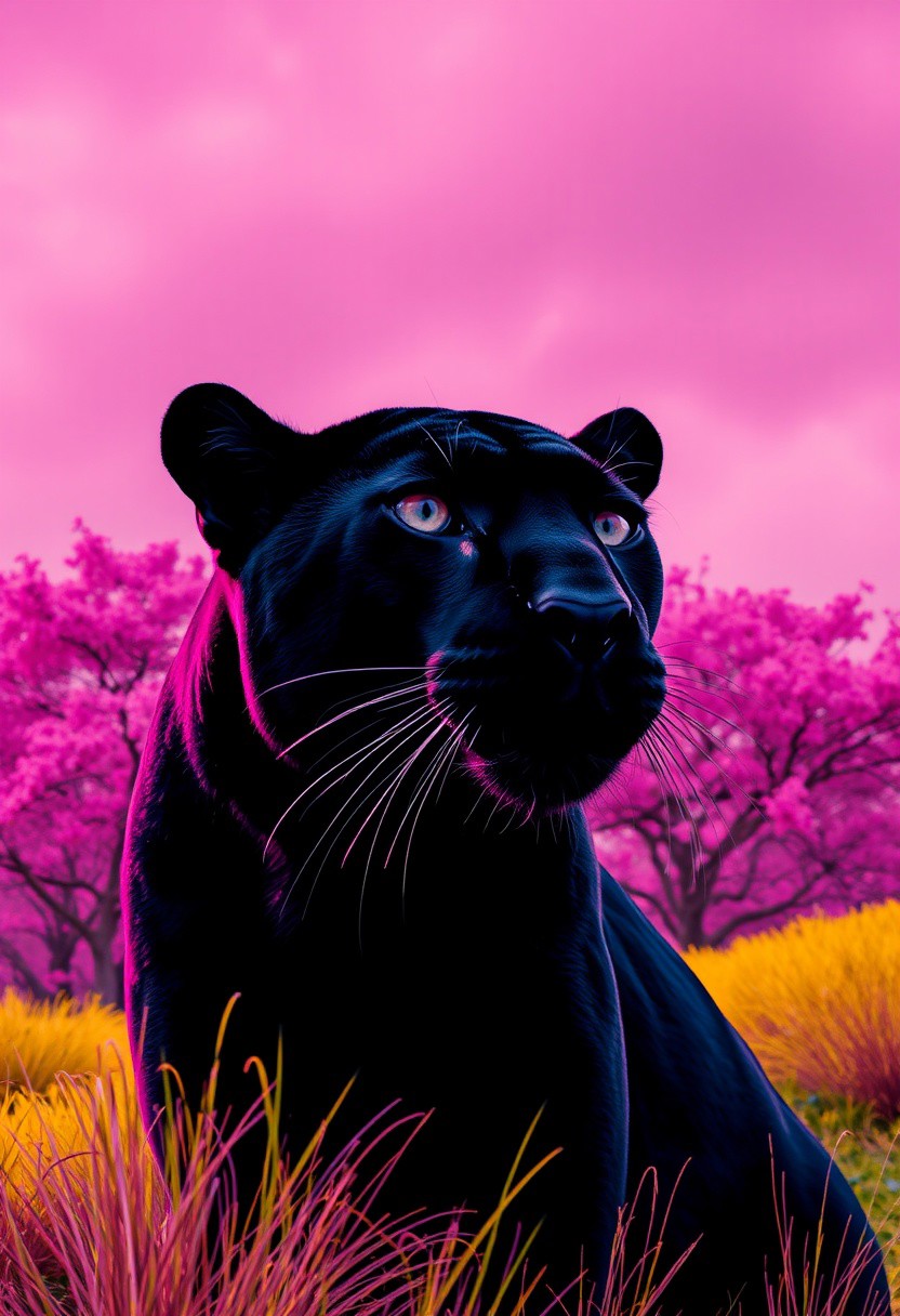 score_9, score_8_up, score_7_up, cinematic photo, dramatic lighting, a black panther staring at you from far away, pink sky, lush pink trees, yellow grass patch, asain style, David Hockney, Ascii art, gongbi, traditional chinese painting style, neon colors, <lora:Neon_Splash_Art_for_Pony:1>
