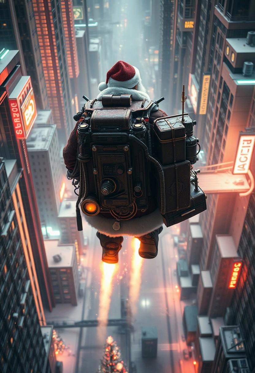 A dramatic high-angle shot focuses on the intricate details of a sleek, cheerful red steampunk jet-powered exosuit, worn by a portly, white-bearded figure, gliding silently through a snow-kissed, steampunk metropolis. The exosuit, adorned with intricate brass and steel gears and powered by a glowing energy core, is bathed in a soft, ethereal glow, flame and heat waves and smoke are jetting out from the bottom of the backpack. The view is from behind of this futuristic Santa Claus, partly cropped out of the image, his silhouette barely visible as he carries a high-tech bag of toys filled with countless wrapped gifts. The city, a labyrinth of towering, steampunk-inspired skyscrapers and neon-lit alleyways, stretches out below, a stark contrast to the traditional Christmas scene. The hyper-realistic image should capture the steampunk aesthetic, with a focus on the intricate details of the exosuit, the futuristic cityscape, and the play of light and shadow. The image should have a shallow depth of field, emphasizing the exosuit and blurring the background, creating a sense of mystery and wonder.