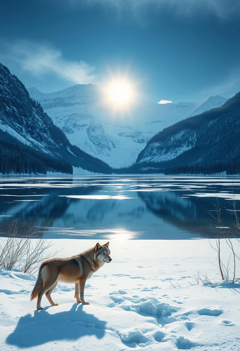 Tranquil Lake, frozen lake, wolves, spectacular, winter scenery, masterpiece, best quality, ultra-high resolution, high detailed