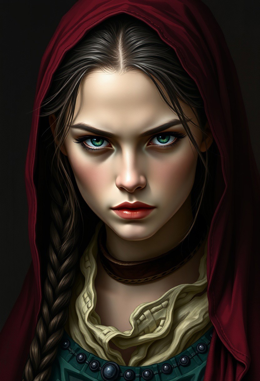 A highly detailed digital portrait of a young woman embodying the intensity of a heretical Christian figure. She has an intense, defiant gaze, conveying both conviction and inner strength. Her clothing reflects medieval or Renaissance Christian symbols but with subtle deviations to suggest her outsider status—symbols of rebellion or forbidden knowledge subtly integrated. The color palette is a bold triad of deep garnet, rich green, and soft yellow, creating a striking contrast against darker, shadowed surroundings. Her expression is both serene and intense, capturing a quiet defiance and a deep spirituality that challenges orthodox beliefs.