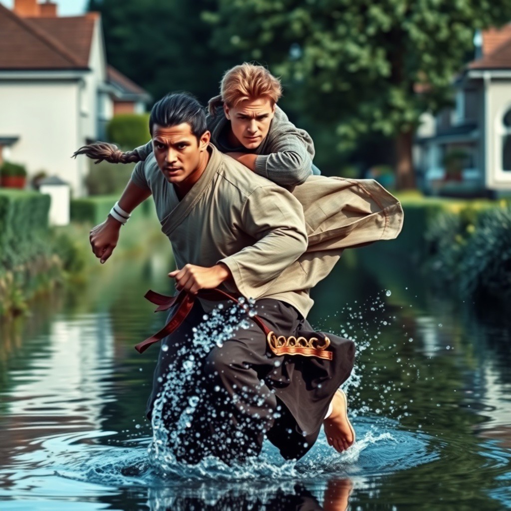 A powerful martial artist inspired by a Chinese warrior, with a single long braid and a muscular build, running across the surface of a canal in a residential area, creating splashes. He is carrying a young British man on his back. The young man has short, tousled hair and is wearing casual clothing. The martial artist has deep-toned skin and is wearing traditional Tang-style clothing, flowing dynamically with his movement. The background features suburban houses, a well-maintained canal with green vegetation alongside, and reflections on the water surface. The color palette includes vibrant blues and greens, enhancing the sense of motion and power.