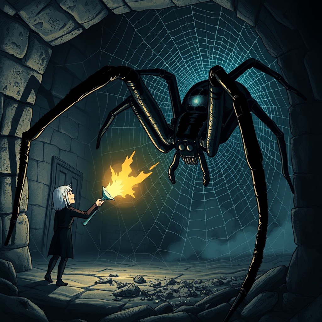 She guides the torch toward the corner, revealing a web-laden alcove. Suddenly, her eyes widen as she witnesses a massive black spider, the size of a car, perched ominously, its glossy body glinting in the torchlight, with legs sprawling grotesquely across the ground.