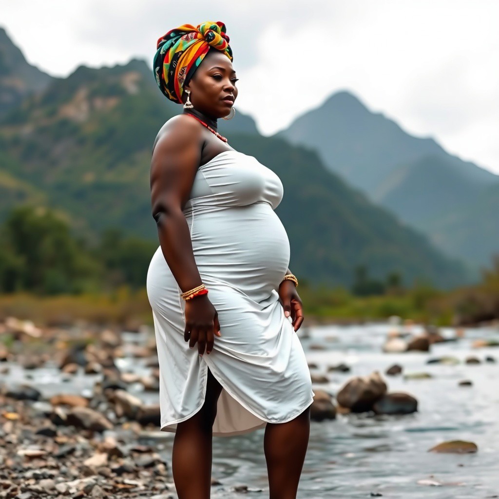 full body shot chubby wide hips African woman dark skin colorful head wrap white body con dress gold anklets barefoot by a mountain stream