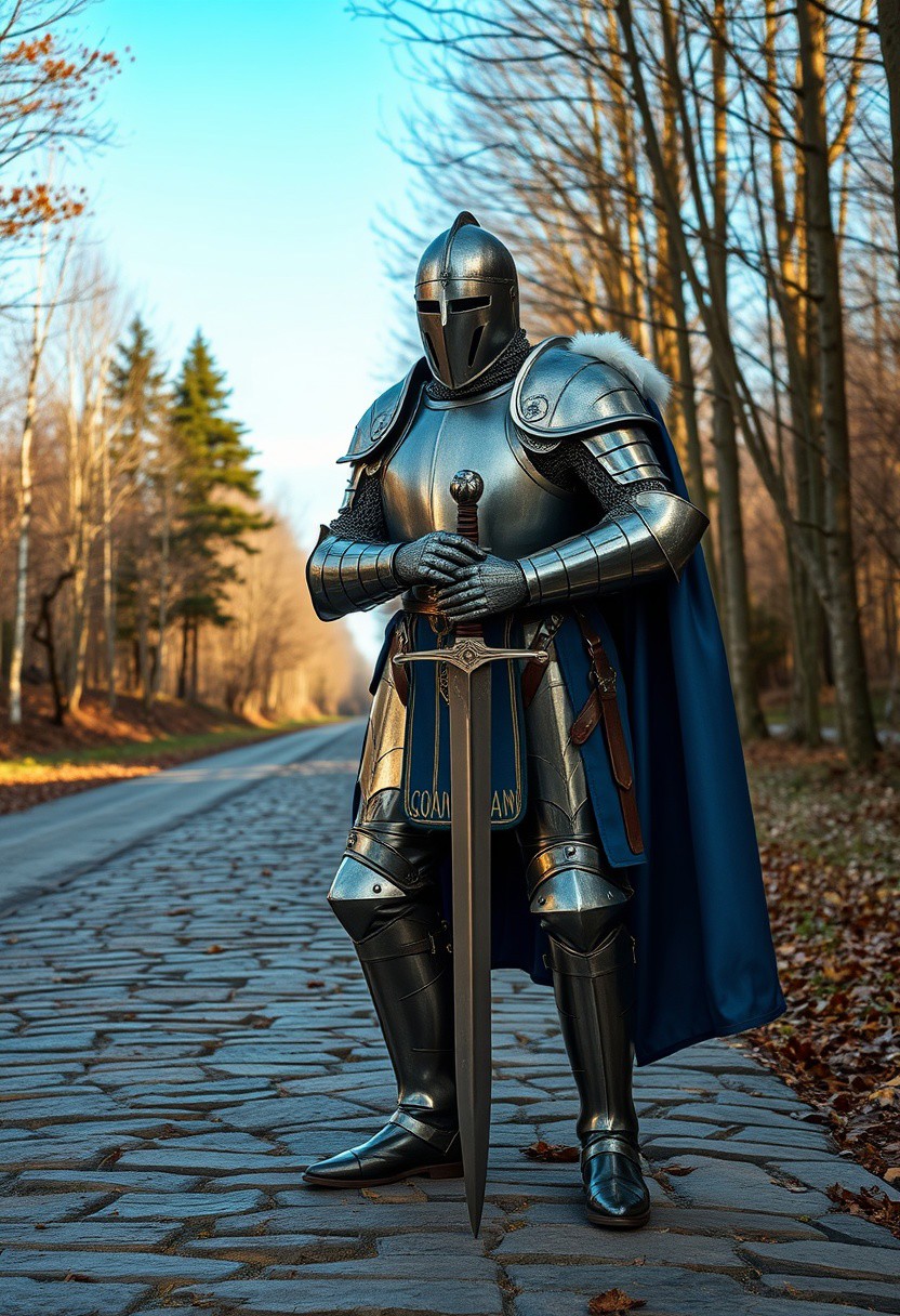 standing male knight, helmet, full plate armor, steel armor, grey armor, zweihander holding to the ground, holding zweihander with both hands, parade rest draw sword, armored shoes, blue jupon with white badger crest, on a stone wide road in a light forest at noon, standing pose, full body perspective, frontal
