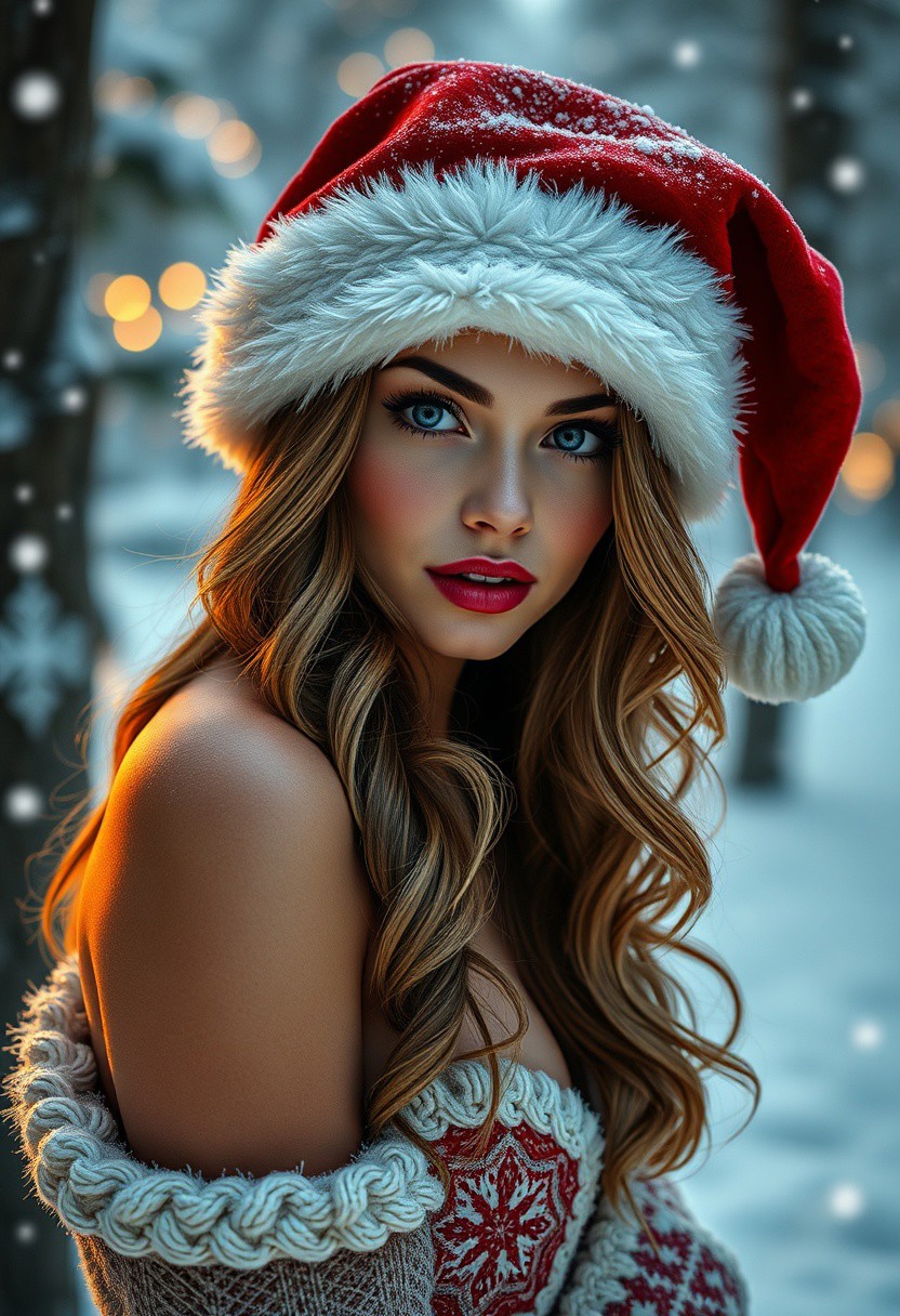 Masterpiece. beautiful woman, pin up, alluring, santa hat, (funny:1.4), snow, interesting angle, alluring, (christmas), high-res, semi realistic, best quality, intricate details, ultra details, good lighting, vibrant colors, very detailed, octane render, ray tracing