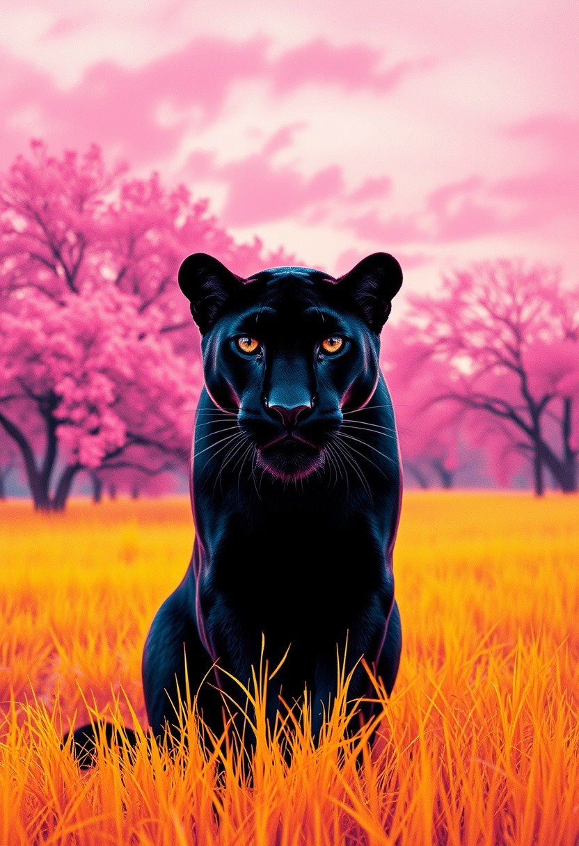score_9, score_8_up, score_7_up, cinematic photo, dramatic lighting, a black panther staring at you from far away, pink sky, lush pink trees, yellow grass patch, asain style, David Hockney, Ascii art, gongbi, traditional chinese painting style, neon colors, <lora:Neon_Splash_Art_for_Pony:1>