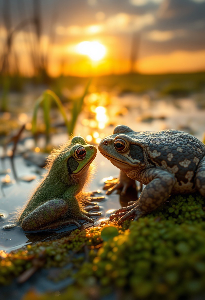 A fuzzy green frog meets a brown toad at the edge of the swamp, frog is furry and cute, toad has mottled brown skin, greens and browns, warm sun, dramatic sunrise