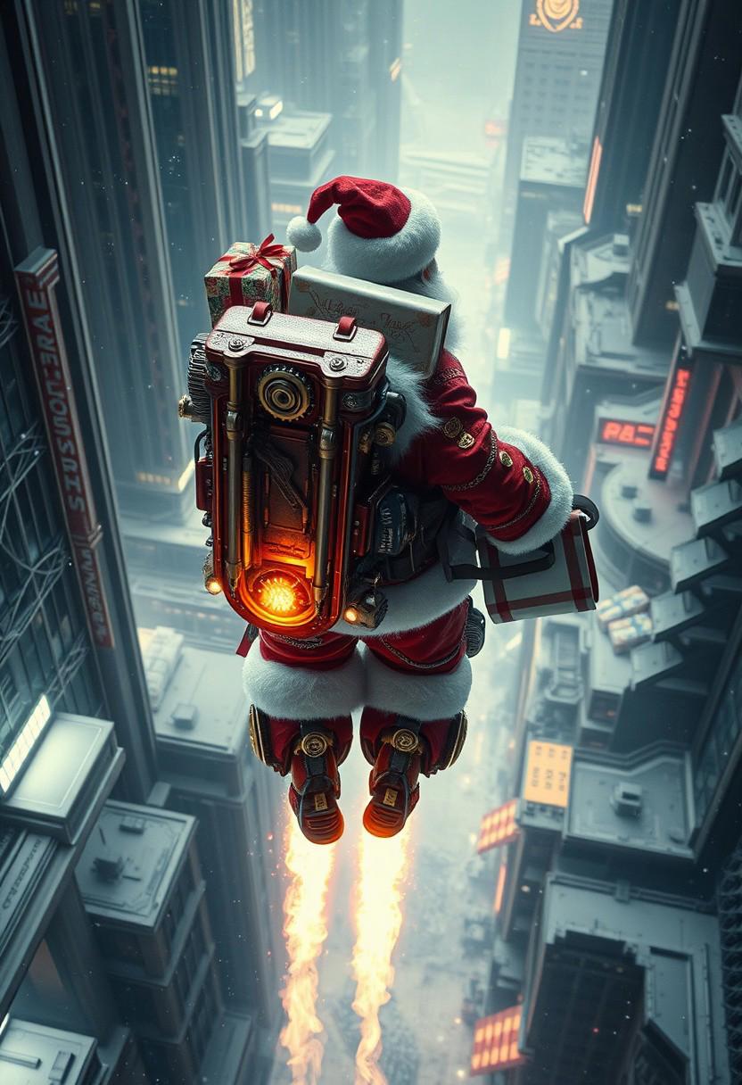 A dramatic high-angle shot focuses on the intricate details of a sleek, cheerful red steampunk jet-powered exosuit, worn by a portly, white-bearded figure, gliding silently through a snow-kissed, steampunk metropolis. The exosuit, adorned with intricate brass and steel gears and powered by a glowing energy core, is bathed in a soft, ethereal glow, flame and heat waves and smoke are jetting out from the bottom of the backpack. The view is from behind of this futuristic Santa Claus, partly cropped out of the image, his silhouette barely visible as he carries a high-tech bag of toys filled with countless wrapped gifts. The city, a labyrinth of towering, steampunk-inspired skyscrapers and neon-lit alleyways, stretches out below, a stark contrast to the traditional Christmas scene. The hyper-realistic image should capture the steampunk aesthetic, with a focus on the intricate details of the exosuit, the futuristic cityscape, and the play of light and shadow. The image should have a shallow depth of field, emphasizing the exosuit and blurring the background, creating a sense of mystery and wonder.