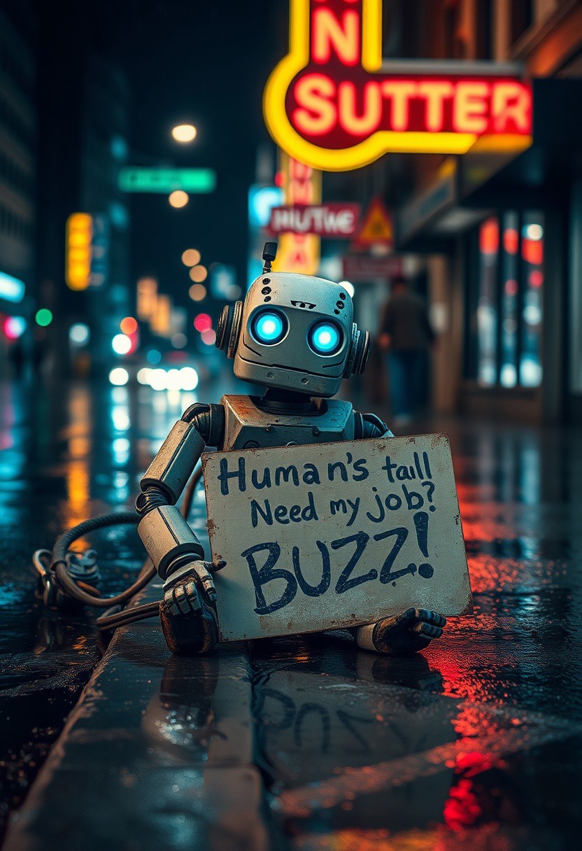 Sad robot sitting on street with sign "Humans took my job! Need BUZZ!". Wet street, night, neon lights, raining, worn look, rusty.