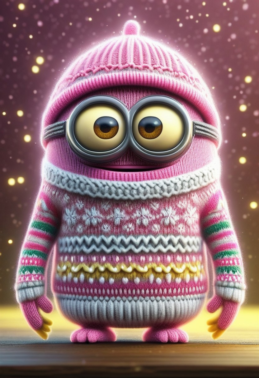 Minion, eating banana, wearing a pink ChristmasSweater on the torso, sweater only below neck, singing, full face uncovered, high quality, beautiful masterpiece, fantasy creature, digital art, glowing sparkles, MinionStyle