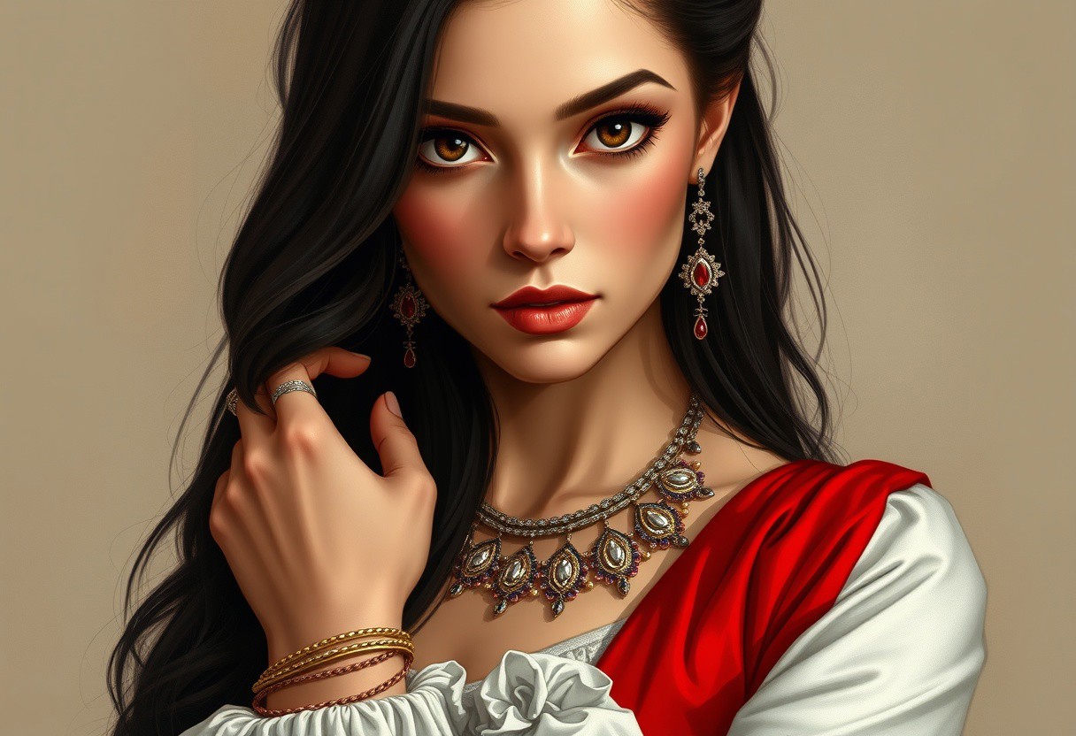 Full body, standing, close-up, a masterpiece of the highest quality(realistic: 1.2), HDR, UHD, 8K, laura:, cinnamon: 1.> Create an illustrated oil portrait of a woman with expressive, mesmerizing eyes and long black hair. She is dressed in a historical dress consisting of bright red and white tones, which emphasizes her elegance. It also features sophisticated jewelry such as bracelets and necklaces that add sparkle and luxury to her look. The background is soft and neutral to draw attention to her and her outfit. The portrait conveys the atmosphere of sophistication and elegance of the Baroque and Rococo styles. Inspired by the works of the Golden Age masters Donatello, Michele Angelo, Leonardo Da Vinci, perfect anatomy, chic and glitz of the Baroque style, refinement and refinement of details, perfect proportions, perfect composition. Modifiers: Sharp Focus, extremely detailed, crisp, high-quality cinematic post-processed dramatic light by Luis Royo, Ultrarealistic occult optical illusion X . R. Gigera FHI, extremely detailed sharp focus . No cropping, no borders, no captions.