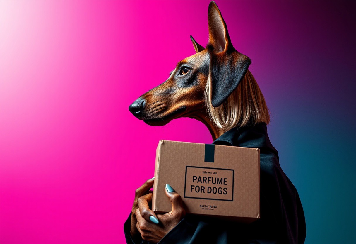 An anthropomorphic brown Dobermann dog with soft, long, natural ears and a blonde bobcut with long hair in the back, wearing a black trenchcoat, depicted in profile, side view. The dog is holding a cardboard box labeled ‘Parfum for Dogs’ in a surreal and avant-garde fashion illustration style. The scene features a turquoise silver grunge aesthetic against a gradient magenta and teal background. The setting includes vivid colors, filigree details, and photorealistic rendering. The lighting is moody chiaroscuro, enhanced by the visual distortion of fisheye cinema prime lenses (9mm) and noir film-style color correction