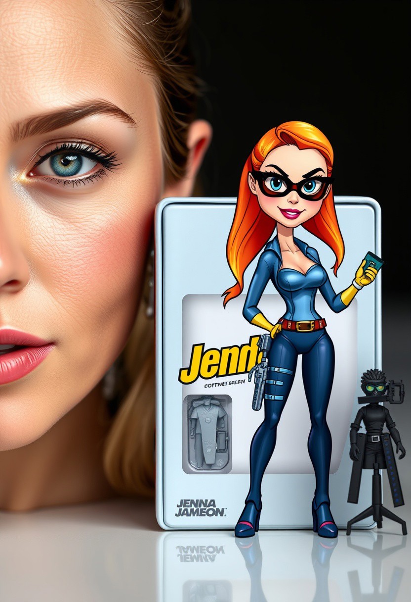 A photorealistic image of Jenna Jameson, lifelike appearance. Beside her, a cartoon-style illustration of het adorns a product packaging, vivid and colorful. The packaging is sleek, with the name 'Jenna' prominently displayed in bold, eye-catching fonts. Next to the packaging, there's a detailed action figure of her, complete with miniature tools and gadgets, capturing his essence as a resourceful hero. The overall composition is balanced, showcasing both the realistic and animated representations of the iconic character.<lora:gonza_v2:0.75>