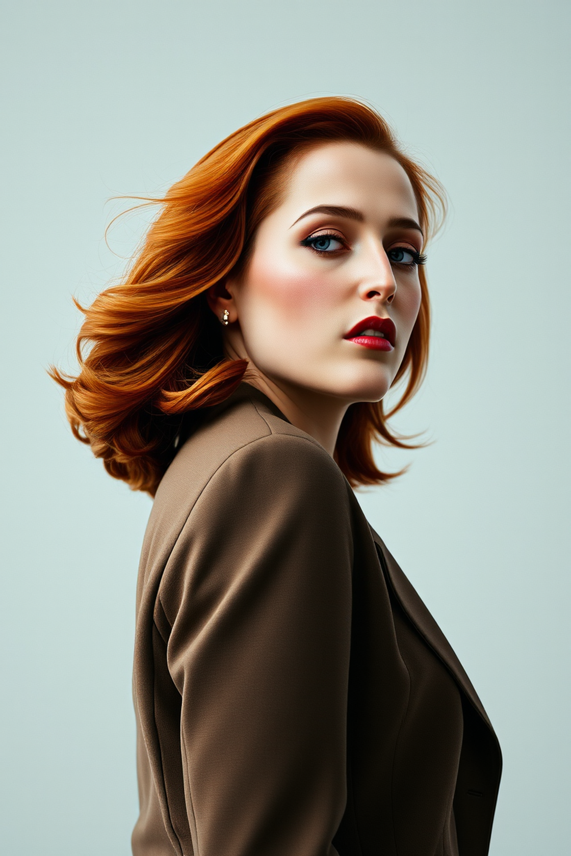 upper body high fashion photo of a woman with red hair. Natural makeup, abstract art, Exquisite detail, high resolution photo, realistic photo, intricate detail, natural lighting, elegant jacket, agentscully