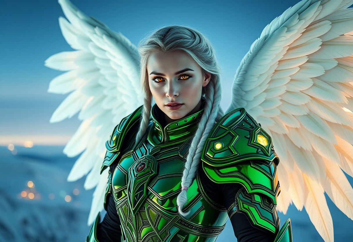 37 yr old hungarian woman in ceramic extremely reflective and green christmas power armor, , majesticwhite feathered angel wings, solo, shoulder armor, glowing golden eyes, , pauldrons, long white braided hair, looking at viewer, christmas , flying over antarctica