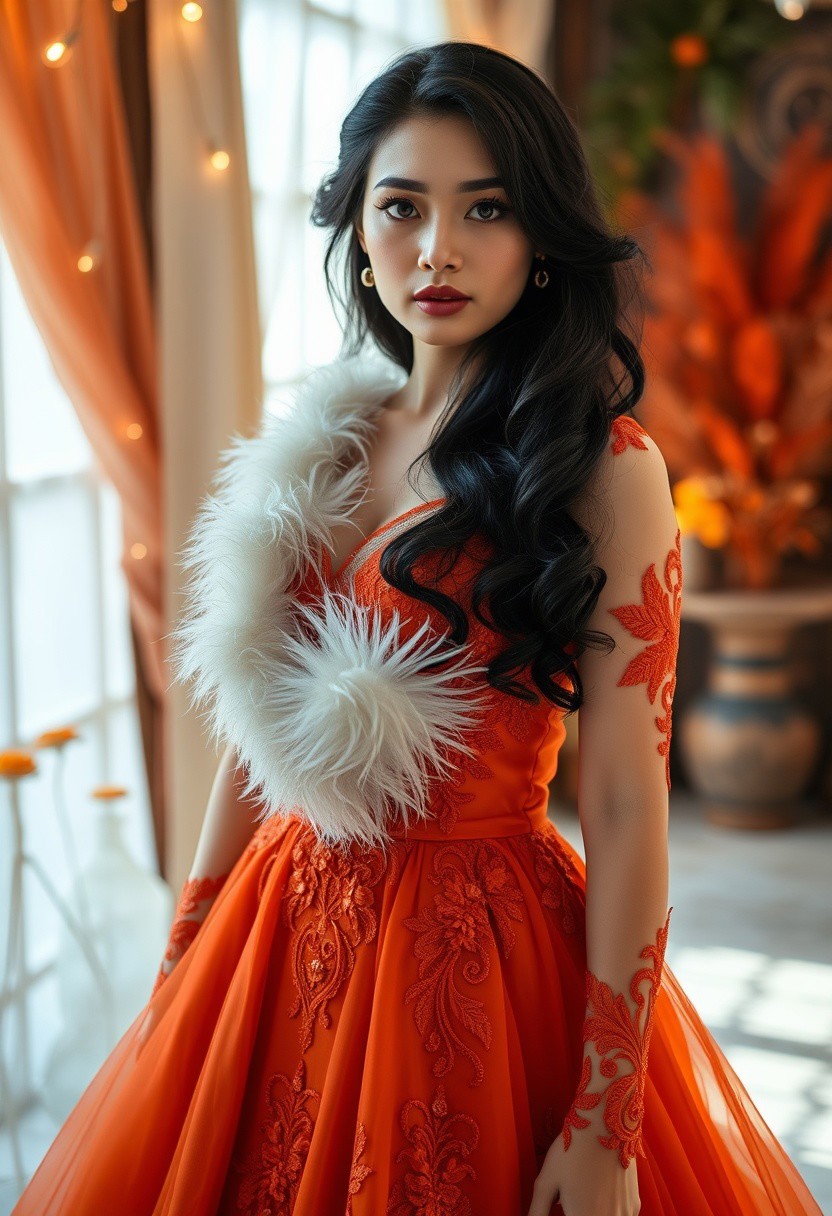 Fashion photography of a striking beautiful asia perfect curvy body beautiful woman with long, flowing black hair and piercing brown eyes that captivate the viewer. The scene is in front view, full shot portrait, shoulder level, straight on angle. Her soft white fur, resembling delicate curls, adds a whimsical texture to the scene. She wears an Burnt Orange Ball Gown: A glamorous, vibrant red gown with intricate detailing, displayed elegantly on a mannequin, creating a bold contrast against lighting vivid romance accents in the environment. The setting merges fantasy and rustic charm, blending elements of rural life with organic, flowing designs. A magical atmosphere permeates the scene, with cinematic perfection captured in intricate, stunning fine details. The overall composition evokes a fertile and enchanting world, combining the grace of high fashion with the dreamlike allure of an elaborate, otherworldly narrative.