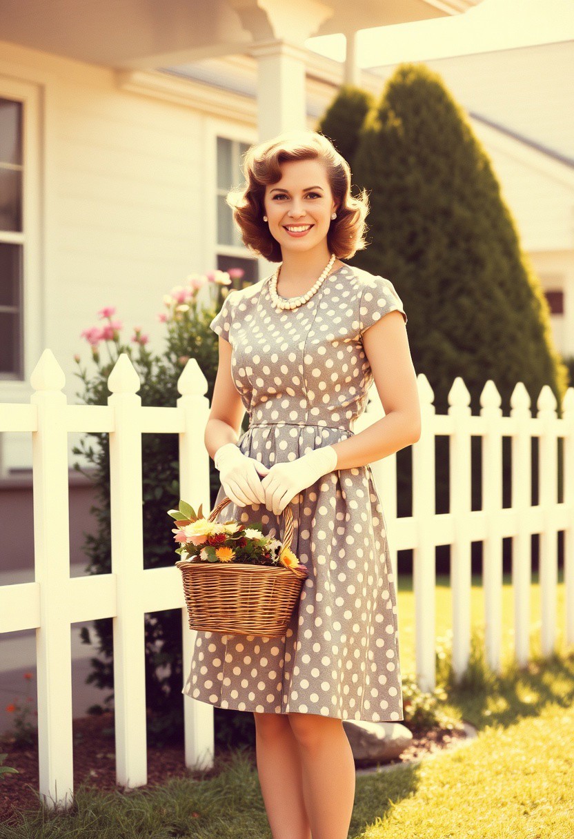 A 1950s-style candid photograph of a woman standing outside a suburban house with a white picket fence. She wears a knee-length polka-dot dress with a fitted waist, paired with a pearl necklace and matching gloves. Her hair is styled in soft curls, and she is smiling as she holds a wicker basket filled with flowers. The lighting is warm and natural, and the photograph has a slightly grainy texture, evoking the nostalgic charm of the era