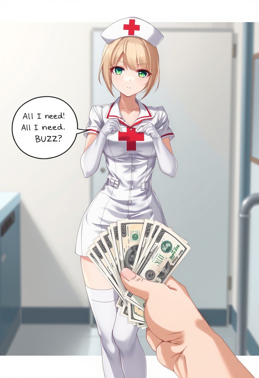 score_9,score_8_up,curvy,expressive,good_hands,<lora:Expressive_H:1>,Expressiveh,depth of field, beautiful, realistic anime style, No watermark, No signature, No logo No pubic hair, No censored, No Deformed body parts, No logo, No Incomplete body parts, 1 girl, 27 year old, beautiful face, nurse, mini skirts, white_pantyhose, leg_garter, white gloves, nurse_cap, white clothes, red cross mark, slender and dynamic nice body, erotic clothes, blonde hair, jade green eyes, angry girl's speech bubble: "All I need is BUZZ!" "A realistic depiction of a nurse in a white uniform and cap with a red cross, standing in a clinical setting. In the foreground, a hand offers a stack of currency, creating a contrast between medical professionalism and monetary implication. The scene is well-lit with a neutral background."
