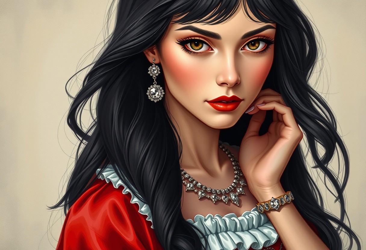 Full body, standing, close-up, a masterpiece of the highest quality(realistic: 1.2), HDR, UHD, 8K, laura:, cinnamon: 1.> Create an illustrated oil portrait of a woman with expressive, mesmerizing eyes and long black hair. She is dressed in a historical dress consisting of bright red and white tones, which emphasizes her elegance. It also features sophisticated jewelry such as bracelets and necklaces that add sparkle and luxury to her look. The background is soft and neutral to draw attention to her and her outfit. The portrait conveys the atmosphere of sophistication and elegance of the Baroque and Rococo styles. Inspired by the works of the Golden Age masters Donatello, Michele Angelo, Leonardo Da Vinci, perfect anatomy, chic and glitz of the Baroque style, refinement and refinement of details, perfect proportions, perfect composition. Modifiers: Sharp Focus, extremely detailed, crisp, high-quality cinematic post-processed dramatic light by Luis Royo, Ultrarealistic occult optical illusion X . R. Gigera FHI, extremely detailed sharp focus . No cropping, no borders, no captions.