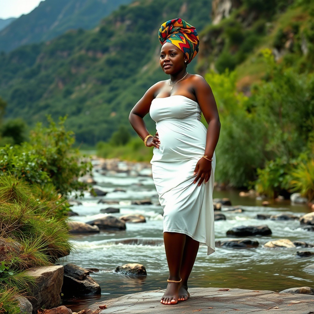 full body shot chubby wide hips African woman dark skin colorful head wrap white body con dress gold anklets barefoot by a mountain stream