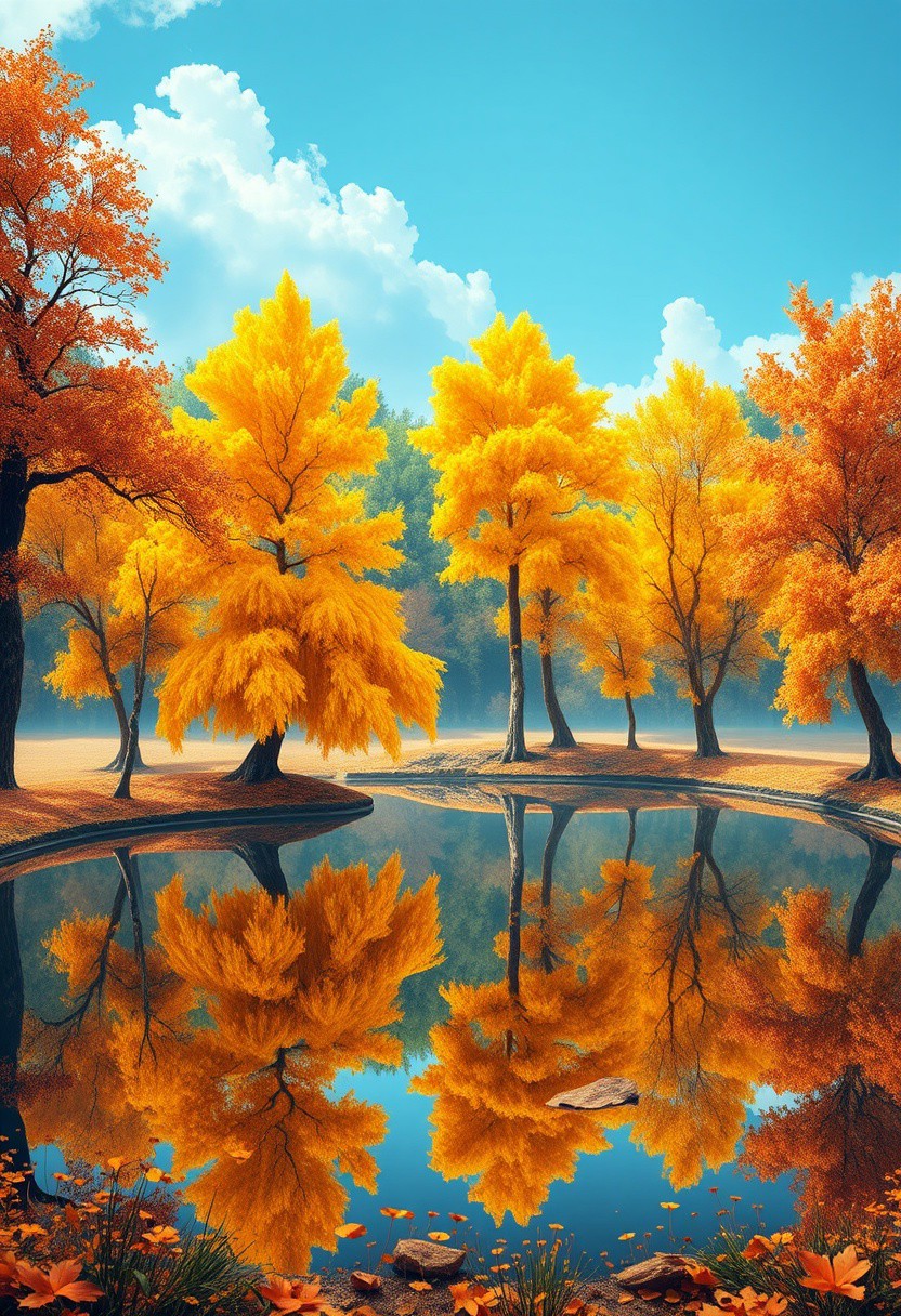 Stunning detail reflection of golden and orange katsura trees around a natural round lake, autumn, realistic, wide shot, art style of Studio Ghibli, magical, whimsical atmosphere, vibrant colors, beautifully lit, serene landscape