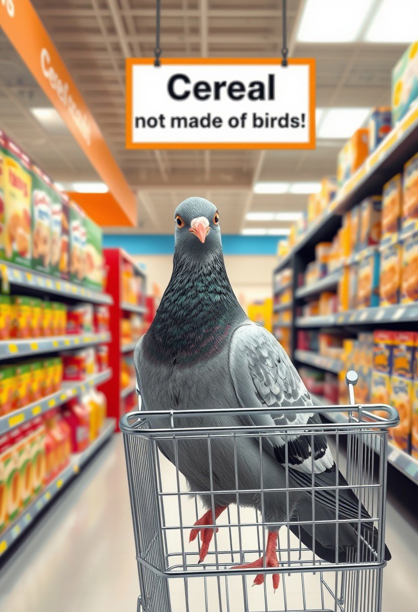 A worried pigeon pushing a shopping cart, the pigeon is in the cereal aisle of the store with a large sign hangs from ceiling reading 'Cereal (not made of birds)'