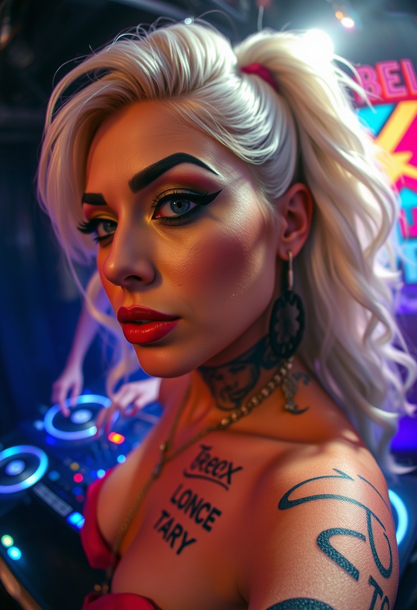 fisheye lenses lgbtq+ transgender dragqueen at a nasty tech house party, white trash,complex thai text tattooes on skin, an infamous dj in the background using a dj conssolle