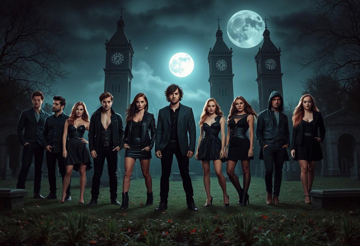 /imagine A dramatic promotional poster for a supernatural TV show, featuring a diverse cast of ten young adults, five men and five women, in a graveyard at night under a full moon. The style should be reminiscent of The Vampire Diaries promotional material without any text or show title. The characters are dressed in dark, stylish clothing. The women have very sexy short dresses. Two imposing clock towers are visible in the background. The mood is mysterious and suspenseful. High detail, cinematic lighting, 8k resolution, --ar 16:9