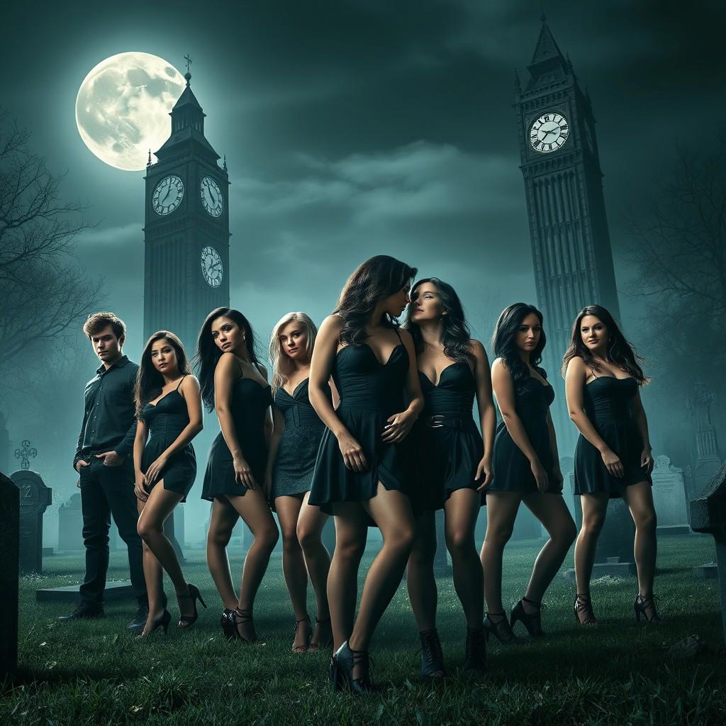 /imagine A dramatic promotional poster for a supernatural TV show, featuring a diverse cast of ten young adults, five men and five women, in a graveyard at night under a full moon. The style should be reminiscent of The Vampire Diaries promotional material without any text or show title. The characters are dressed in dark, stylish clothing. The women have very sexy short dresses. Two imposing clock towers are visible in the background. The mood is mysterious and suspenseful. some of the women are kissing, High detail, cinematic lighting, 8k resolution, --ar 16:9