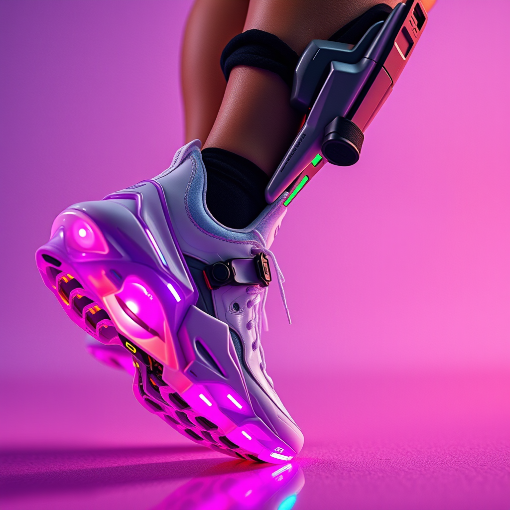 Futuristic athletic footwear, vibrant aesthetics, technologically powered exoskeleton, fashion photography, avant-garde.