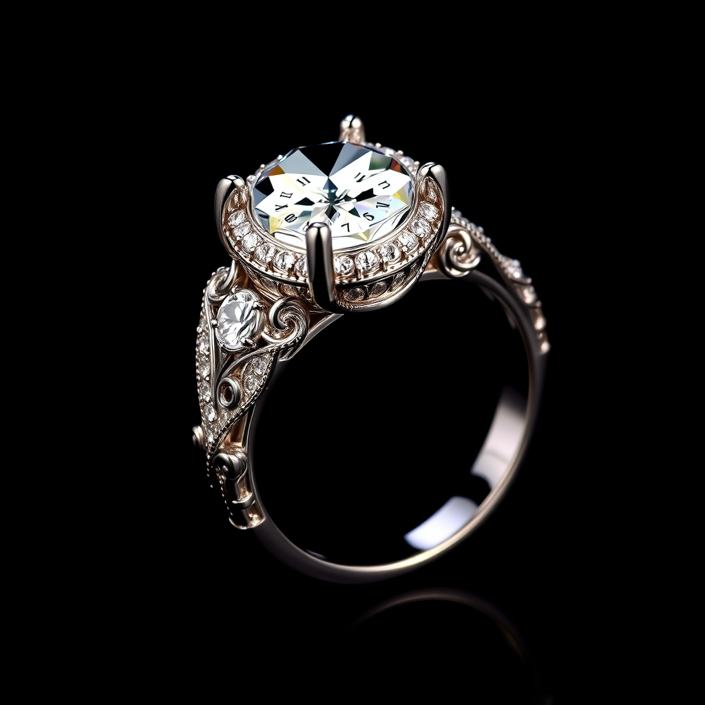 Jewelry photography, dreamy and shiny, sparkling, diamond ring on a black background. The ring is shaped with clock elements, It looks like a luxury jewelry item that might be expensive. in a Victorian style with hand-painted effect, The ring can be made of any metal, but platinum or white gold is a popular choice. You can use different diamond shapes, such as round, princess, or emerald cut. You can also experiment with different diamond colors, such as white, yellow, or pink. You can add other decorative elements , such as gemstones, filigree or engraving.