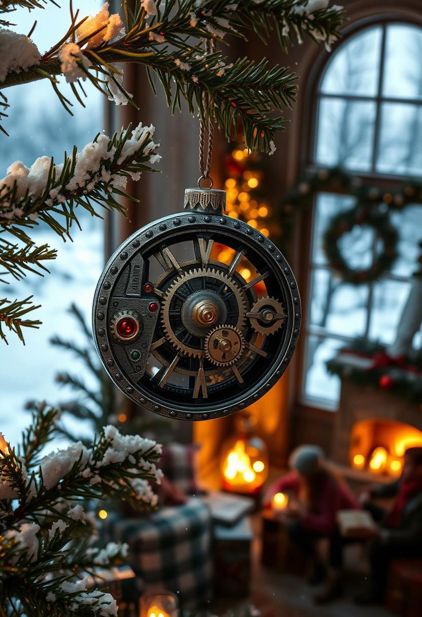 A dramatic very wide close-up of an intricate steampunk clockwork ornament, its pewter and polished brass gears gleaming in the soft glow of the Christmas tree lights. The ornament, adorned with red and green accents, hangs delicately from a branch of a snow-kissed Christmas tree. Outside the window, a winter wonderland stretches out, blanketed in a pristine layer of snow. Inside, a family gathers around a crackling fireplace, exchanging gifts. A magical dust, illuminated by the soft glow of the fire, adds a touch of enchantment to the scene. The overall hyper-realistic image evokes a sense of warmth, otherworldly magic, steampunk nostalgia, and the spirit of the holiday season.