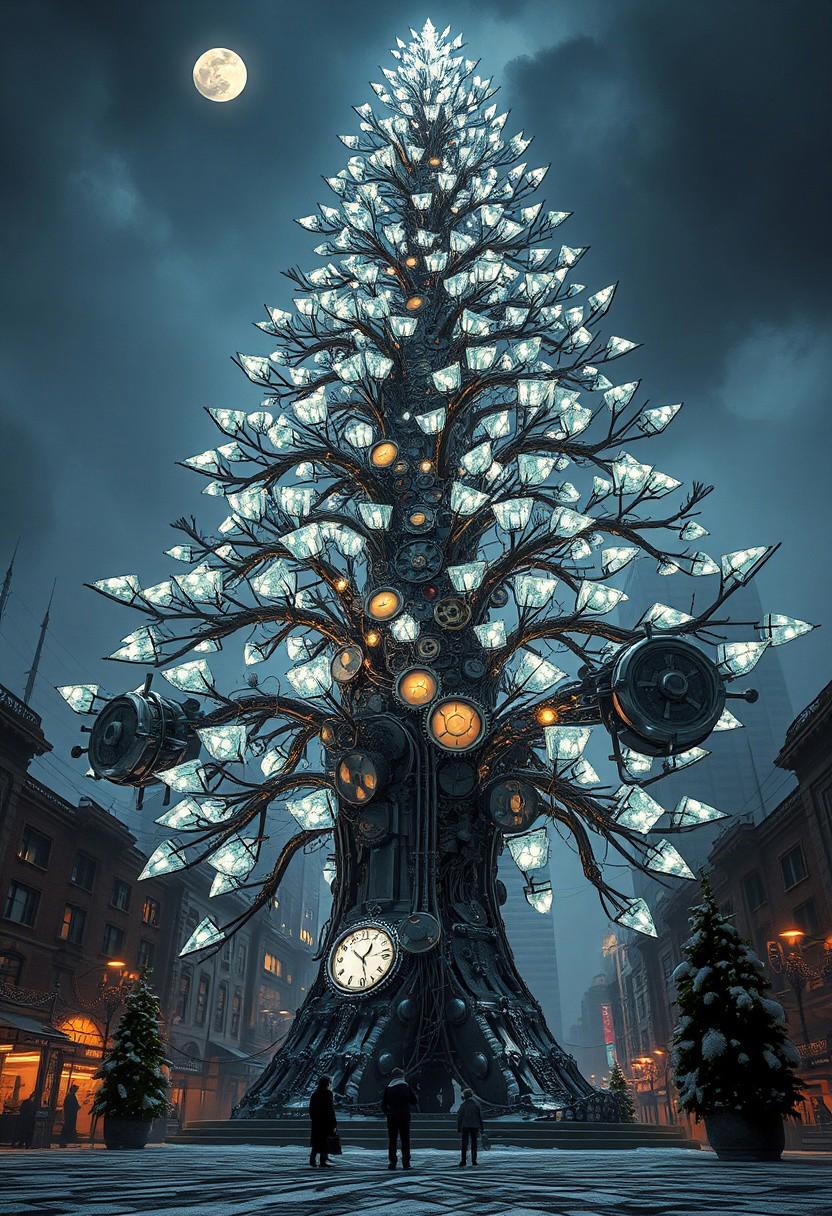 A colossal, mechanical steampunk Christmas tree, its branches adorned with glowing circuits and cogs, dominates a snow-kissed steampunk metropolis. Its metallic trunk, a marvel of steampunk engineering, with an excessive level of baroque detailing, reaches towards a dark sky, while its roots delve deep into the city's energy grid. The tree's leaves, made of translucent panels, shift and shimmer, displaying a mesmerizing light show. The moon, not visible in the image, sends soft rays of moonlight filtering through the leaves to the ground. A lone figure, a tiny silhouette against the towering tree, gazes up in awe. The air is filled with a sense of wonder and mystery, as if the tree holds secrets of the universe. The hyper-realistic image should capture the awe-inspiring sight of this technological marvel, with dramatic chiaroscuro lighting and a focus on the intricate details of the tree's mechanical components. The scene should evoke the spirit of a classic Victorian Christmas card, with a touch of steampunk flair and a hint of otherworldly magic.