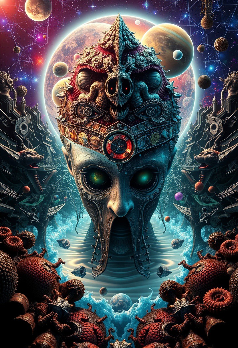 DMT, lsd inspired optical 3d inner mind journey, illusion in time . includes hidden traces of, bio matter, insects, faces, reptilian creatures, planets, microbes, peaceful , inspirational,deep sea life , yin yang, cycle of life, surf, AI cyborg integration