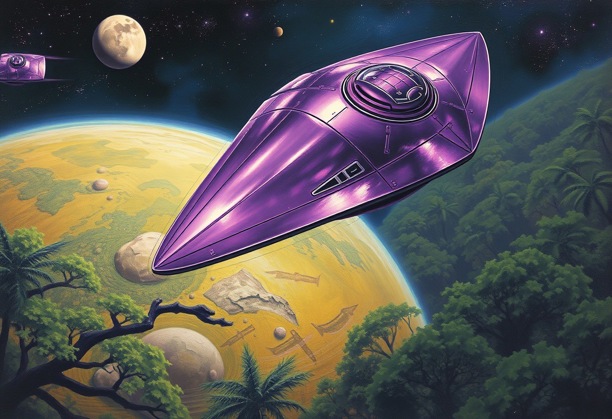A curvy purple metallic spacecraft orbiting over a jungle planet, close up on the spaceship, in the style of an oil painting, scifi, cosmic, astral
