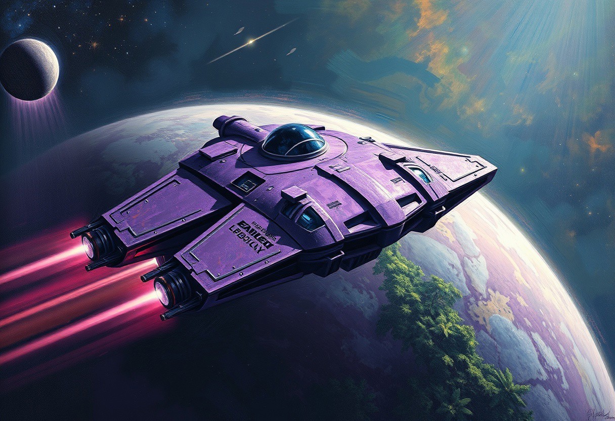 A purple metallic spacecraft orbiting over a jungle planet, close up on the spaceship, in the style of an oil painting, scifi, cosmic, astral