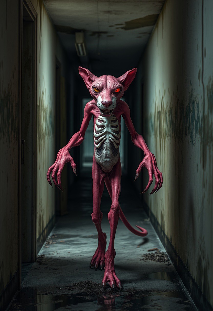score_9, score_8_up, score_7_up, score_6_up, depth of field, highly detailed, BREAK Pink Panther, malnourished, skinny, bony, sunken eyes, dirty matted fur, mange, patches of fur missing, scabs, claw marks, anaemia, bones visible under flesh, glowing red eyes, long mangled claws, long mangles finger nails, hyper realistic hands and feet, long gnarled teeth, long arms, long fingers, malformed, extremely narrow waist, hipbone visible, ghoulish,no human, BREAK in a long hallway stands the Pink Panther, this Pink Panther is a twisted creature unlike his well known counterpart, Pink Panther is standing in a doorway, menacingly, with his hands by his sides, his hands reach and are dragging on the floor, Pink Panther is walking towards the viewer at the other end of the hallway, the building is dilapidated with water damage, water is dripping from the ceiling and running down the walls, it is dark, low lighting, mold is growing on the walls, this building has been abandoned and condemned, night, doorway,,low key,dramatic lighting, film grain,