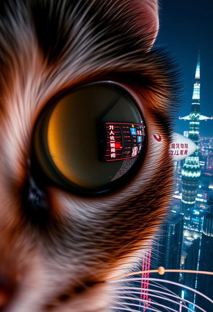 extreme close up portrait of a cat's eye reflecting the a futuristic Tokyo skyline at night from a very high level, the skyline is with futuristic skyscrapers and futuristic transports and futuristic aircraft and spaceships in a variety shapes and sizes, the airships covered with lights and advertisements in Japanese, reflecting in the cat's eye is a huge airship that has an advertisement with a Japanese cat on the side, the cat's eye has takes up 85% of the image