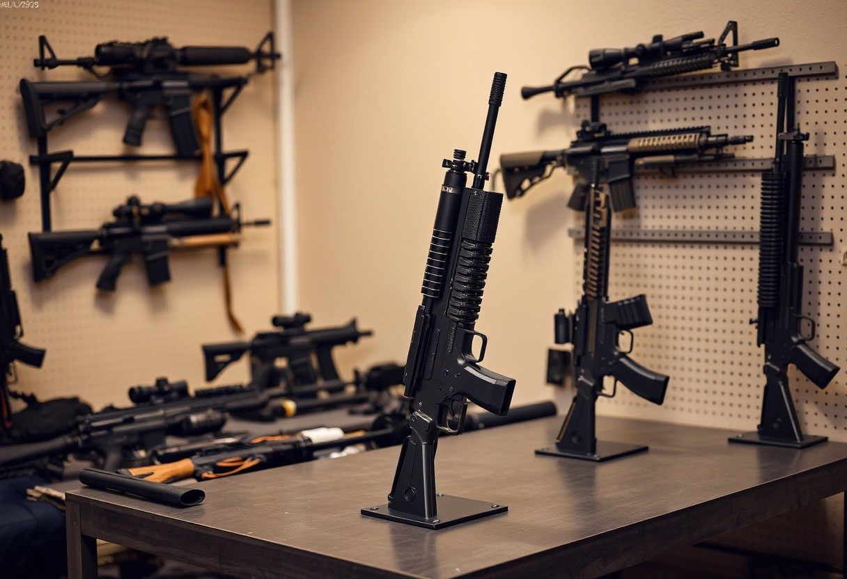 Weapon racks, Modern weapons, Guns, military equipment, Indoors, Weapons on tables, military setting
