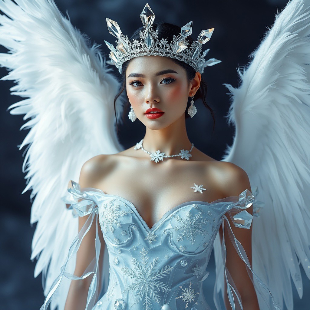 Avant-garde Christmas fashion, ethereal model in translucent crystalline gown resembling frozen waterfall, sweetheart neckline adorned with 3D snowflakes, floating geometric pieces of ice-like material around the dress, white feathered angel wings with metallic tips, crown made of illuminated crystal icicles, otherworldly atmosphere, high-end fashion photography, perfect lighting, 8k quality