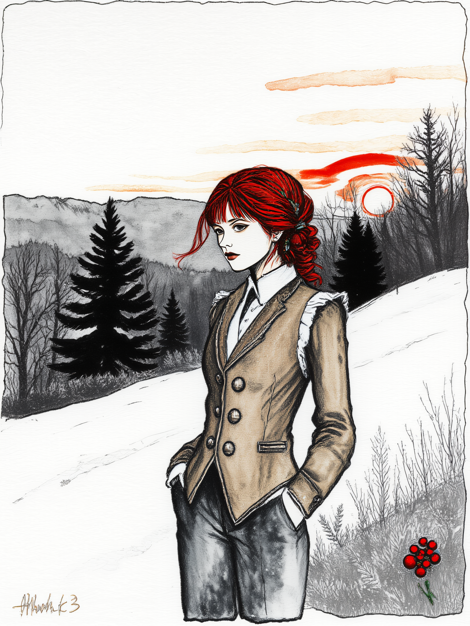 Vertical thirds, 1st ink wash winter scene, 2nd redhead in christmas waistcoat, 3rd setting sun