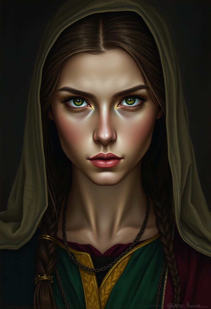 A highly detailed digital portrait of a young woman embodying the intensity of a heretical Christian figure. She has an intense, defiant gaze, conveying both conviction and inner strength. Her clothing reflects medieval or Renaissance Christian symbols but with subtle deviations to suggest her outsider status—symbols of rebellion or forbidden knowledge subtly integrated. The color palette is a bold triad of deep garnet, rich green, and soft yellow, creating a striking contrast against darker, shadowed surroundings. Her expression is both serene and intense, capturing a quiet defiance and a deep spirituality that challenges orthodox beliefs.