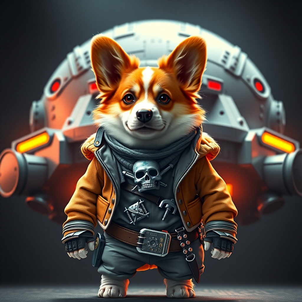 Anthropomorphic Corgi Jedi, space pirate clothes, huge spaceship behind, cyberpunk style, furry, cinematic, epic