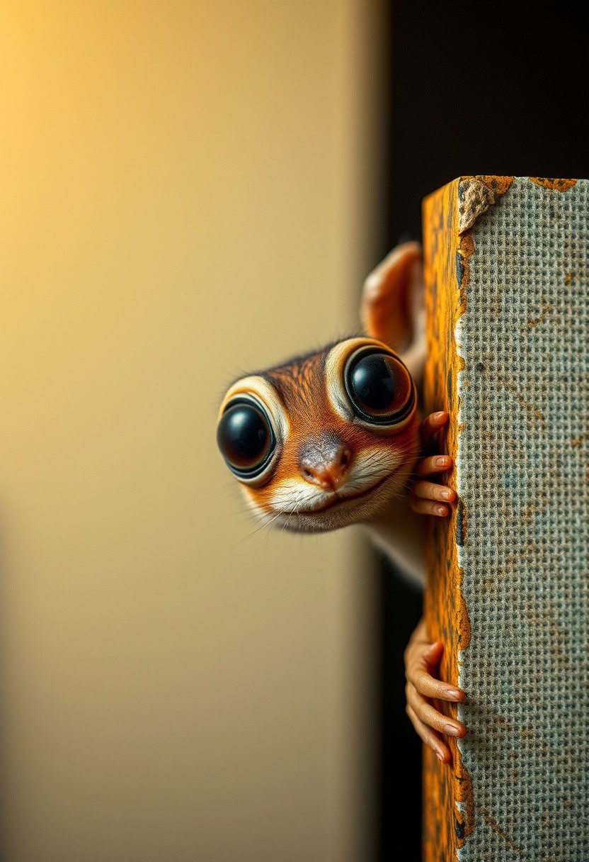 A whimsical creature peeks into the right side of a vertical canvas, its large, curious eyes staring directly into the frame as if observing the viewer. The frame itself appears to bend slightly, reacting to the creatureâs playful presence, creating the illusion that itâs part of the scene, Vibrant Glow