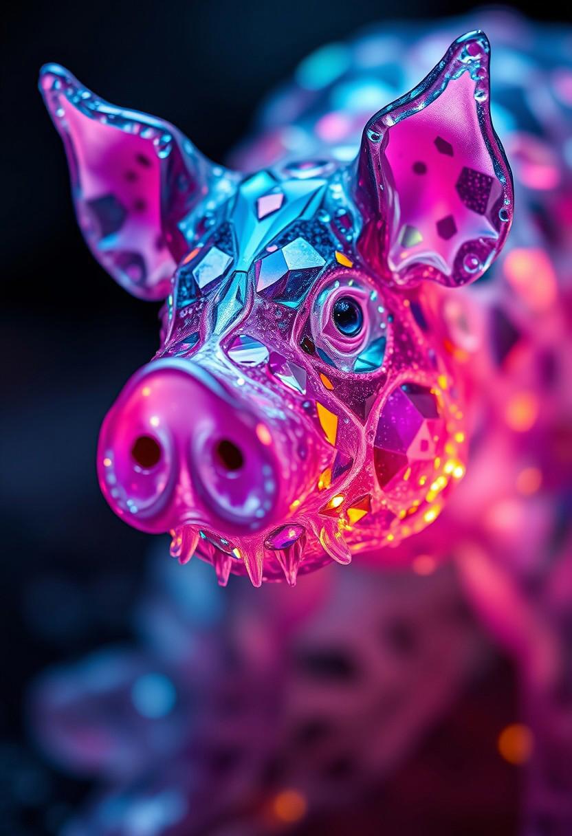 creature like a pig body made of glowing colorful gems and crystal,Alien Flora, water hydroforming, terraforming. Alien Flora, Miki Asai Macro photography, close-up, Miki Asai’s visual style is ethereal and dreamlike, capturing the beauty of nature in a delicate and poetic way, hyper detailed, trending on artstation, fantastic Realism and Sharp Focus, studio photo, intricate details, highly detailed, by greg rutkowski detailed face, detailed skin, reflection